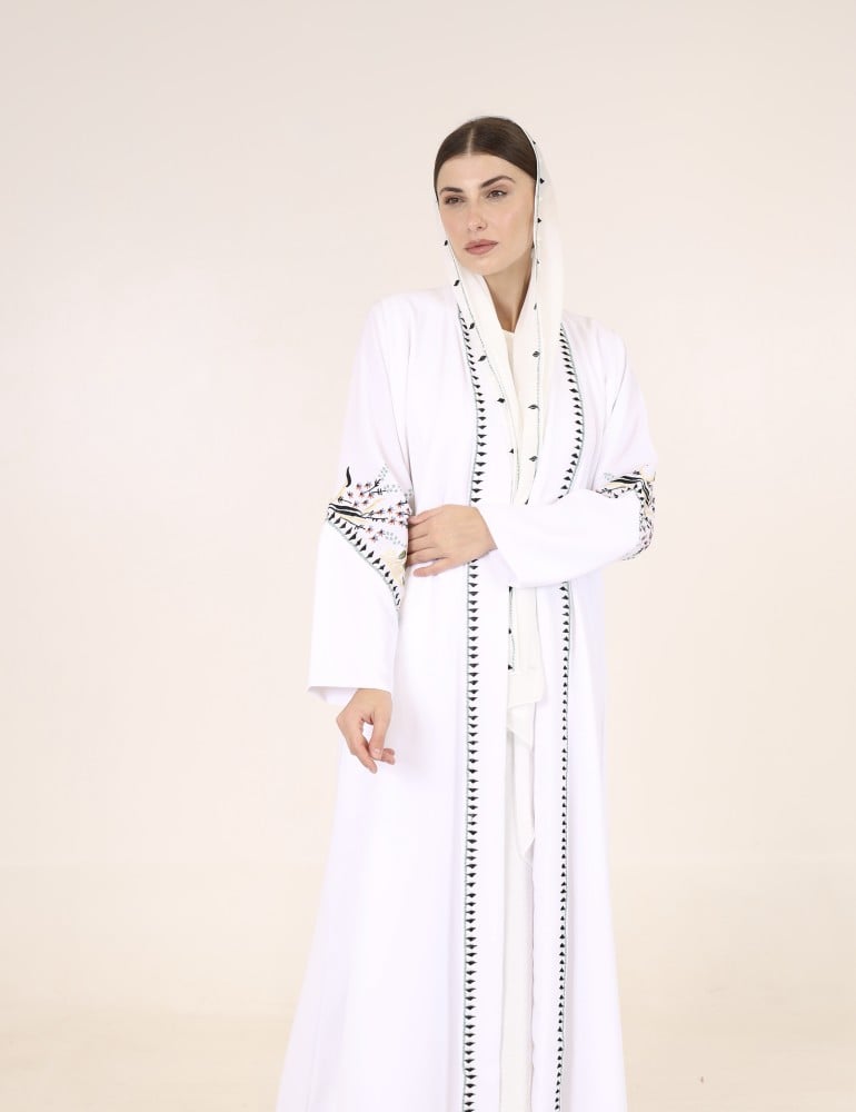 عباية صيفية ربيعية مفعمة بالحياة بترطيز ملون ومشرق وبأعلى درجات اللون الأبيض الجميل، وباكمام واسعة ومريحة ، خُيطت بأجود أنواع الكريب الاندونسي، لتعطيك طلة مُشرقة ومبهجة ومختلفة جداً.